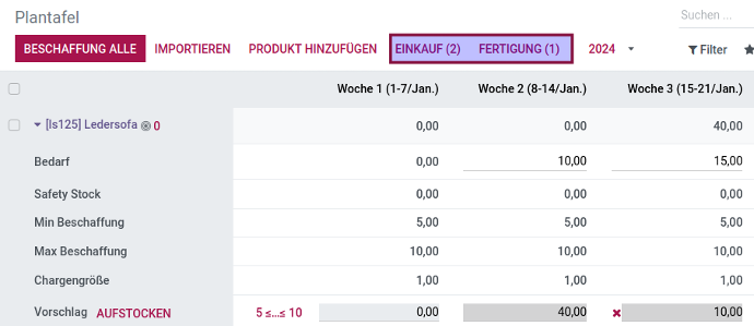 You want ERP material planning? Track product demand and stock levels in real time. The system adjusts upcoming plans automatically based on minimum stock, batch size, and safety buffers.